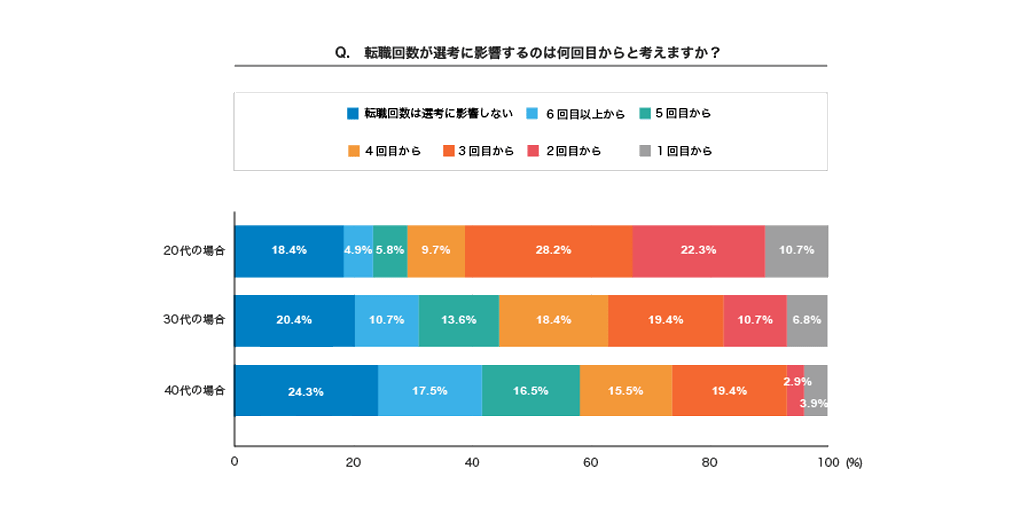 企業の採用担当者に行ったアンケートでは、20代の場合において選考に影響する転職回数は「3回目から」とする回答が多いです。転職回数を不安材料として抱えたくない場合は、20代での転職は2回までにしておくのが良いと言えそうです。