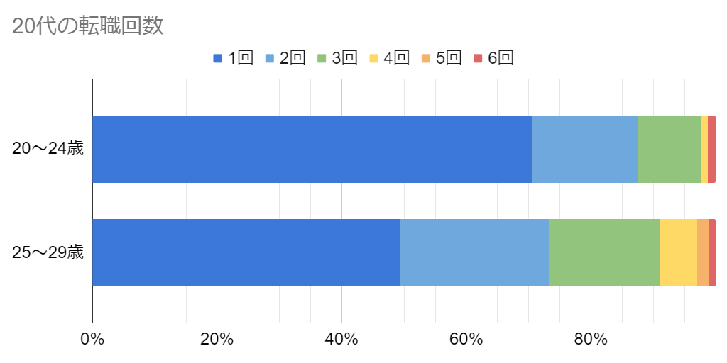 転職経験無しの人(全体の約半数)を含めて母数にすると、20代の転職回数の平均は約1回になります。