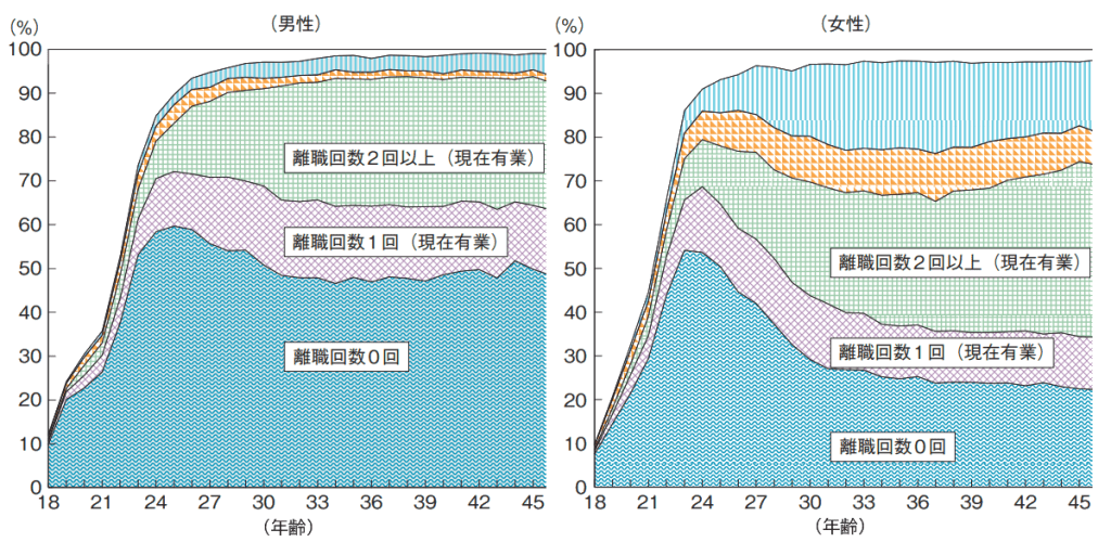 さらに男性の場合で興味深いのは、そもそも離職しない人(離職回数0回)の割合が約半数に及ぶところです。